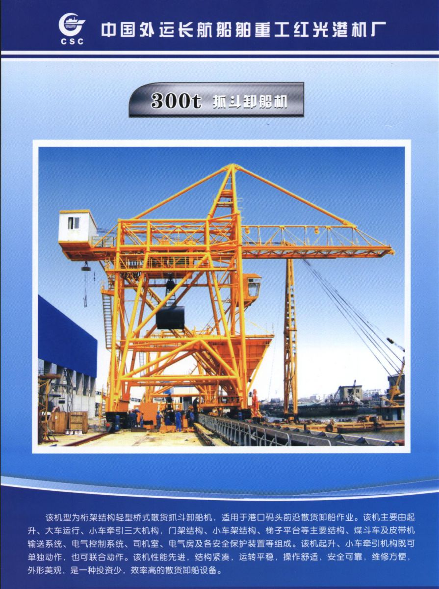 本機具有的功能:抓斗進入艙內(nèi)──閉合抓斗挖取物料──抓斗提升出艙口──小車運行至設在卸船機跨度內(nèi)的料斗上空后打開抓斗放料──物料落入料斗內(nèi),經(jīng)料斗下部的振動給料機,然后通過機內(nèi)帶式輸送機送到碼頭后沿一路高架皮帶機上。整個過程可以人工或半自動操作。本機環(huán)保方式為:地面水供到機上水箱,再由水泵向各噴水點供水。整機的大車運行機構(gòu)可沿江邊軌道行走,可任意改變平行于江邊的作業(yè)位置,作業(yè)完畢后把前大梁仰至固定的位置,設安全鉤將前大梁鉤住。本機還具有不需卸下抓斗也可將清艙機械從碼頭上吊入作業(yè)船艙的功能。